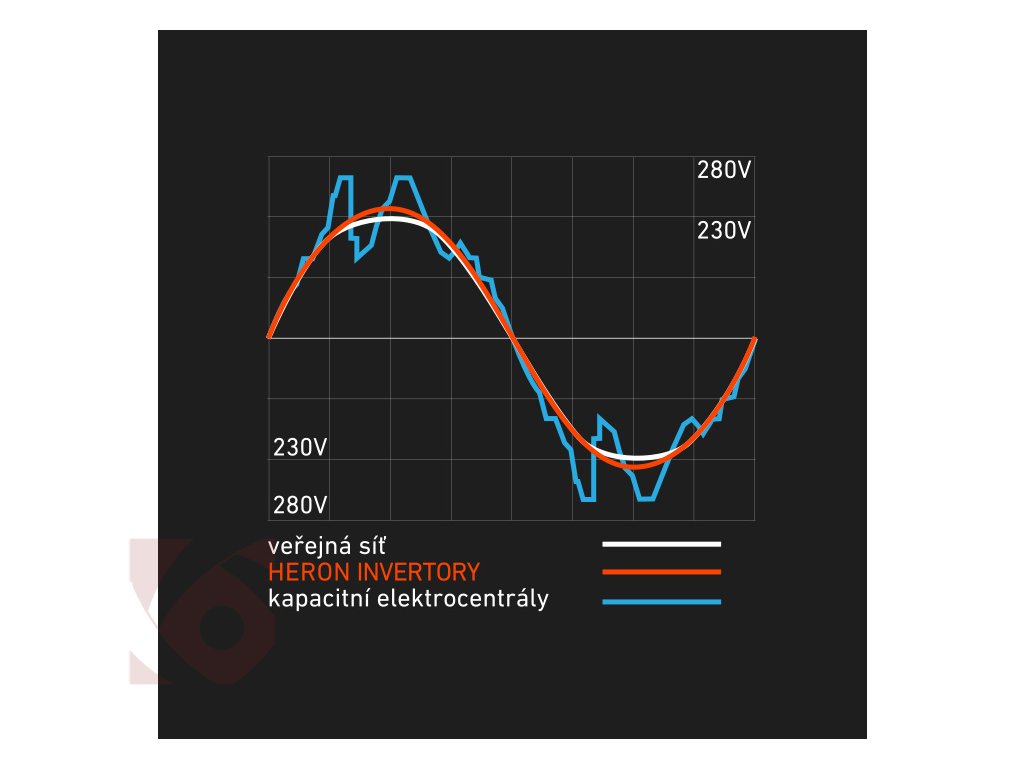 Díky vynikající charakteristice výstupního napětí jsou invertorové elektrocentrály HERON vhodné k použití také jako záložní zdroj pro fotovoltaické ostrovní systémy. Tyto elektrocentrály zaručují dokonalou výstupní křivku a spolu s funkcí automatické regulace výkonu představují spolehlivého partnera sofistikovaným nabíječkám ostrovních systémů.