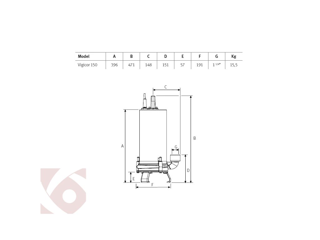 Model VIGICOR je ponorné, jednostupňové čerpadlo s nerezovým drtičem pro odčerpávání šedé vody obsahující vláknitou hmotu. Průchod pevných částic je přibližně 8 mm (MAX).