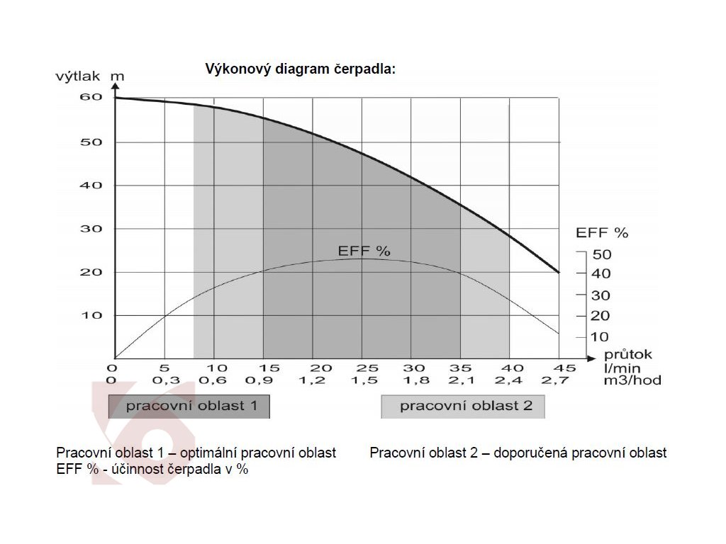 Výtlak 60m, průtok 45 l/min, napětí 230 V, kabel 15 m, průměr soustrojí 78 mm, výtlačná přípojka 1", hloubka ponoru max. 70 m, ponorné odstředivé čerpadlo pro čerpání čisté vody