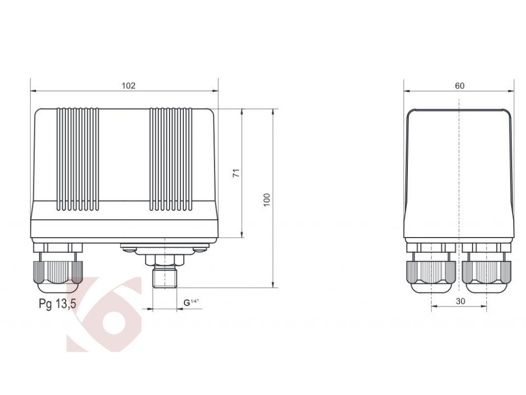 Tlakový spínač s továrním nastavením zapínacího tlaku 0,29 MPa a vypínacího tlaku 0,49 MPa. Připojení k vodovodnímu řadu pomocí převlečné matice s vnitřním závitem G1/4“. Tlakový spínač může sloužit k ovládání jak jednofázových čerpadel (230V) tak i třífázových čerpadel (400V).