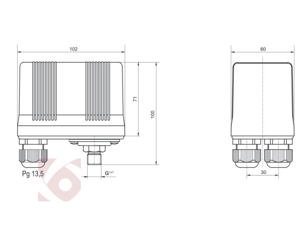 Tlakový spínač s továrním nastavením zapínacího tlaku 0,20 MPa a vypínacího tlaku 0,35 MPa. Připojení k vodovodnímu řadu pomocí vnějšího závitu G1/4“. Tlakový spínač může sloužit k ovládání jak jednofázových čerpadel (230V) tak i třífázových čerpadel (400V).
